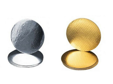 These are 12" round thin, round cake boards used for stacking, mousse, tarts, cheesecake and more. These are 65 pt boards sold individually. They are gold on one side and silver on the other.